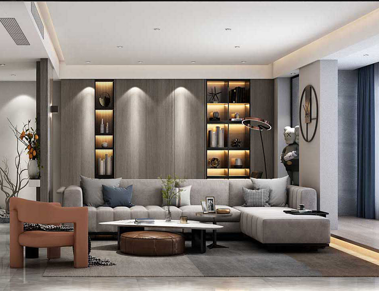 灰色系家具搭配愛馬仕橙和千鳥格紋,不同顏色的搭配,增加輕松的生活氣息。