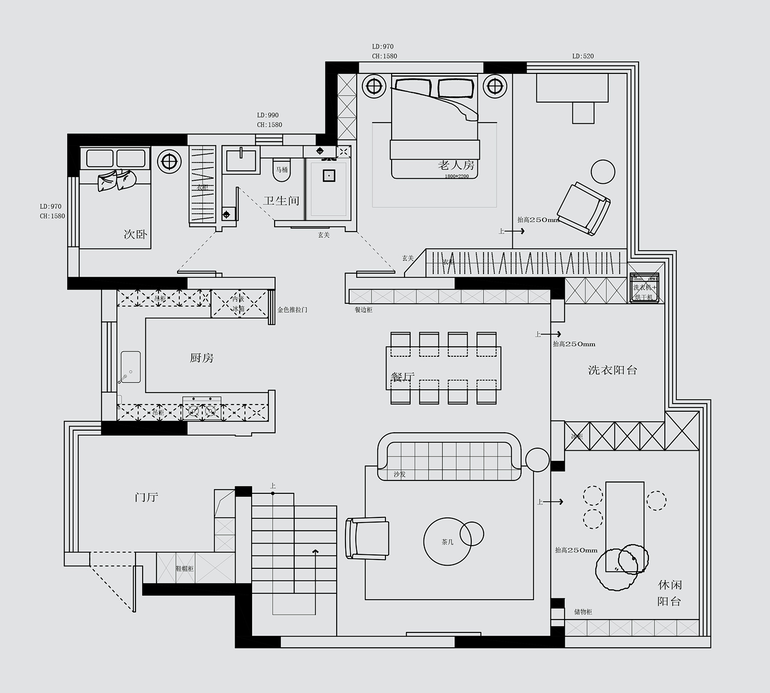 設計理念:客廳以灰色作為主色,黑白點綴其中,呼應電視背景墻的爵士白大理石,張弛之間,盡顯包容大度之態(tài);落地氣泡燈活脫一個頑皮的精靈,平添幾分俏皮可愛氣;