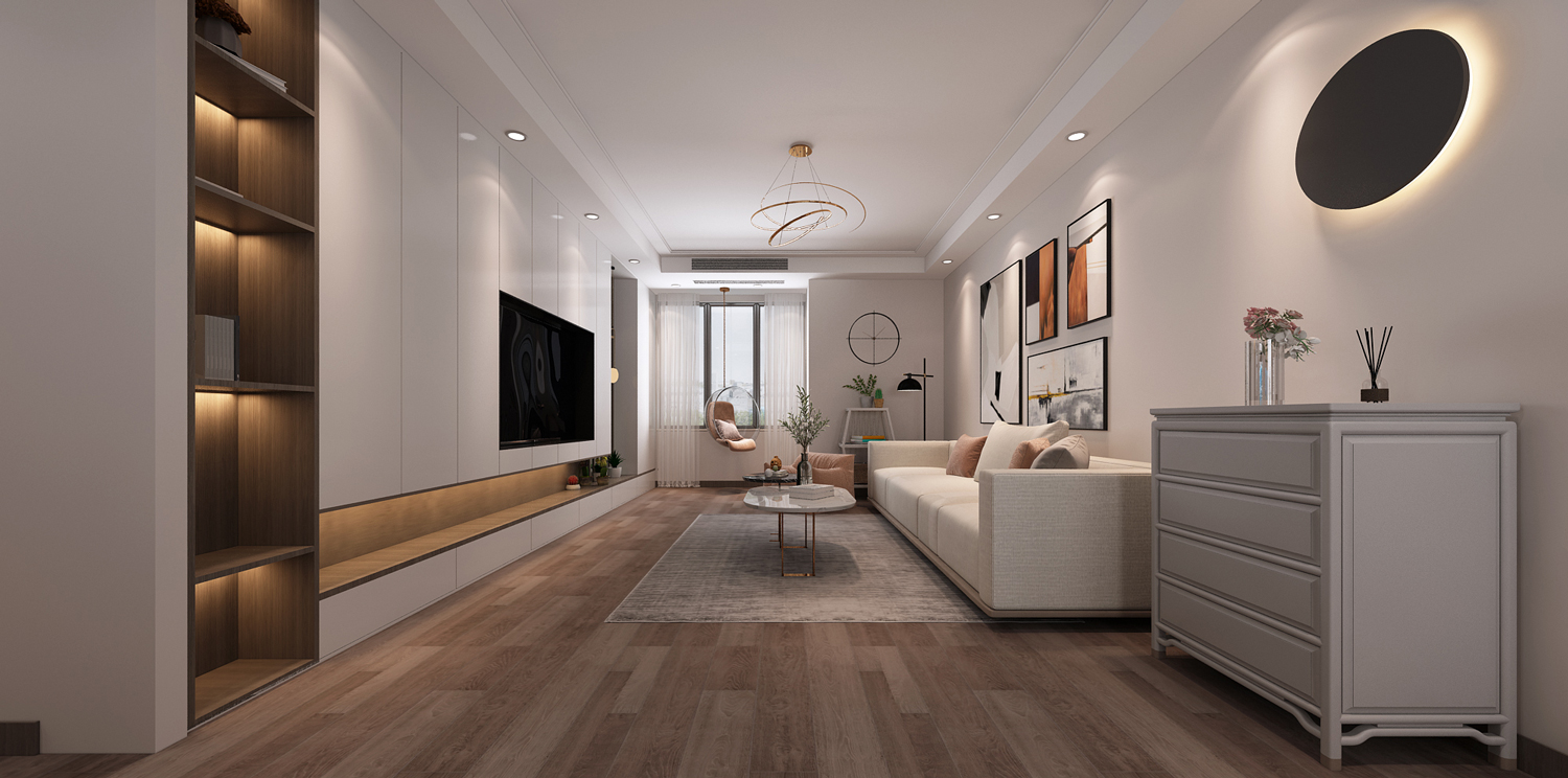客廳:此戶型南向臥室較小將南向陽臺歸于臥室所用,同時為增加客廳采光,保護臥室隱私,采用隔柵作為南向陽臺與客廳之間的隔斷,既保證了客廳的采光,也維護了臥室的隱私,電視墻的儲物格設(shè)計滿足了客戶收納需求,由于客戶不需要晾曬陽臺,北陽臺融為了餐廳的一部分,餐邊柜與儲物柜的設(shè)計讓整個空間連貫的更加完整,公共區(qū)域最大化的收納滿足了客戶后期人口變化對儲物的需求