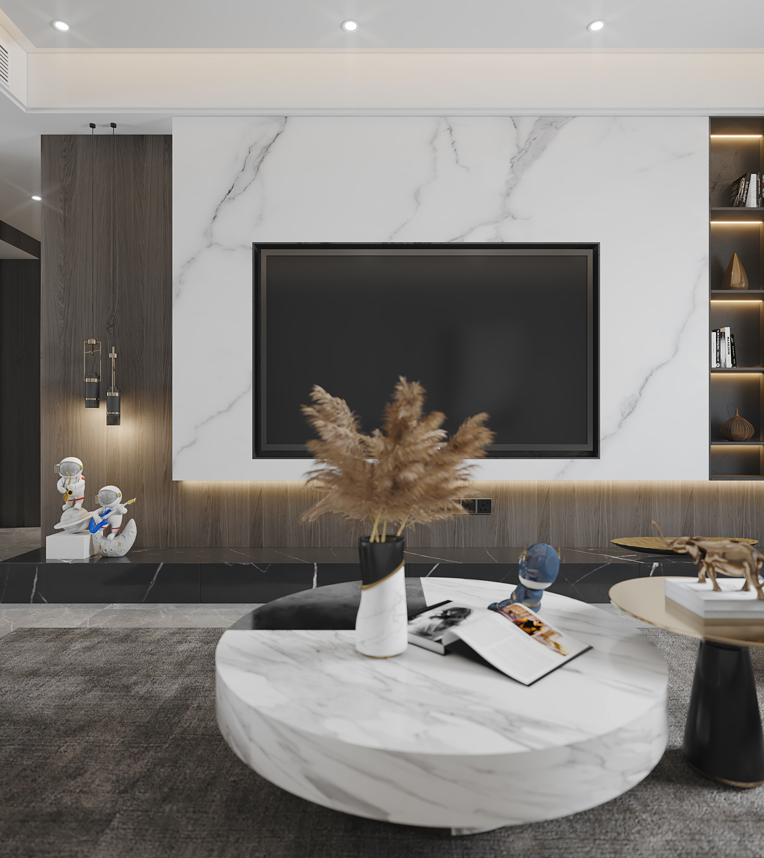 客廳的設(shè)計(jì),使用大理石、硬包以及金屬的搭配,砌造出最為純粹、直接的空間質(zhì)感。