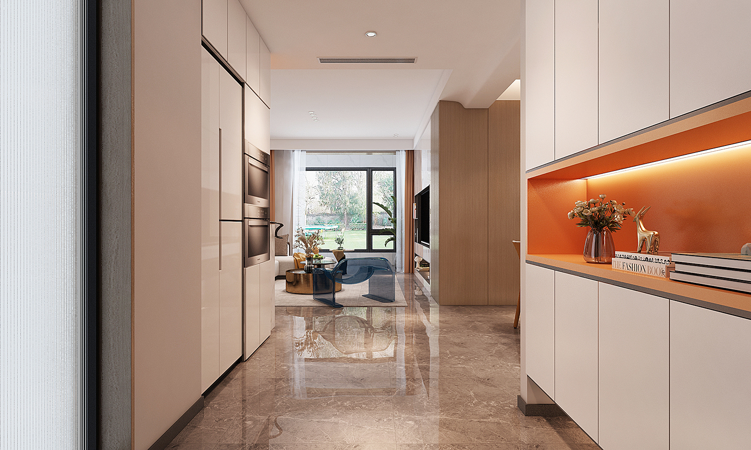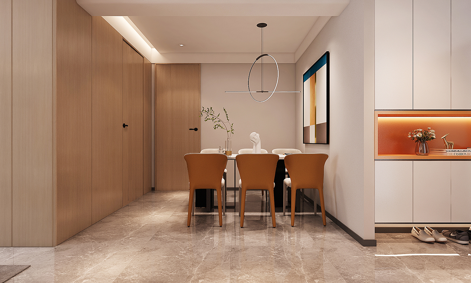 設(shè)計理念:本案以簡潔明快的設(shè)計風(fēng)格為主調(diào),全面考慮,在總體布局方面,盡量滿足四口之家生活上的需求,主要裝修材料以木紋色為裝飾飾面,以愛馬仕橙為點綴玄關(guān)及各種景點,創(chuàng)造一個溫馨,健康的現(xiàn)代家庭環(huán)境.環(huán)境室內(nèi)設(shè)計區(qū)別于簡單的裝飾設(shè)計就在于環(huán)境藝術(shù)設(shè)計是從全局出發(fā),而不僅僅著眼某一點或某一個墻面的裝飾.利求達到統(tǒng)一中帶有變化,和諧中產(chǎn)生對比的要求。