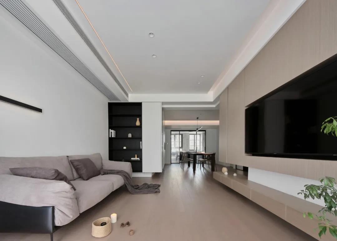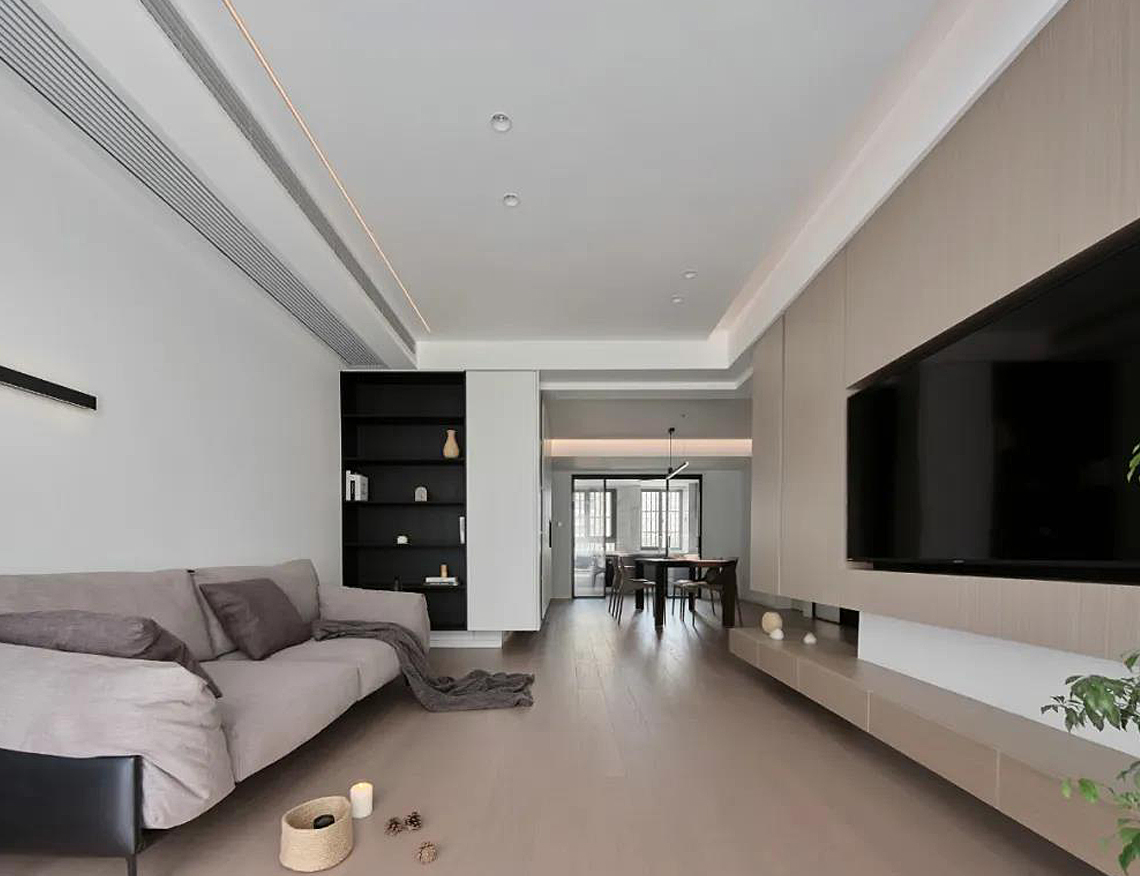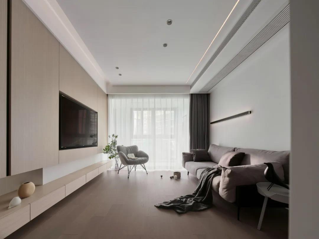 電視背景墻用木飾面裝飾造型,電視內(nèi)嵌,空間看起來更簡(jiǎn)潔清爽,滿足屋主對(duì)純凈空間的向往。