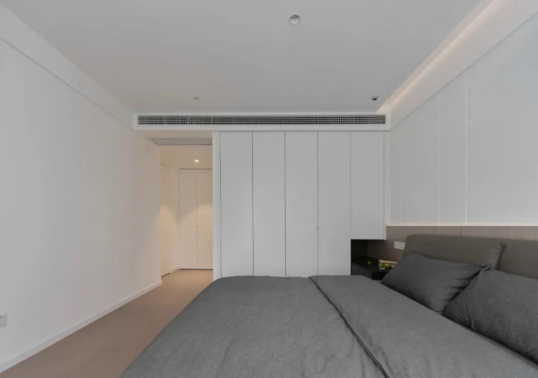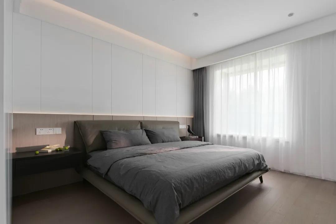 主臥延續(xù)客廳的無主燈設(shè)計(jì),簡(jiǎn)約的吊頂和床頭背景墻都暗藏?zé)魩?,讓空間更有層次。