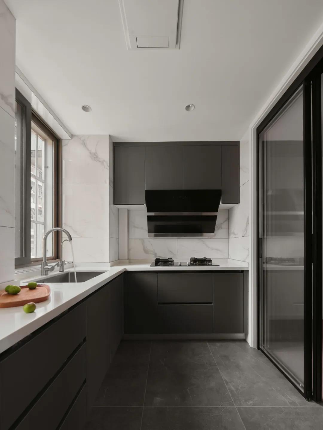 高級(jí)灰櫥柜,簡(jiǎn)約大氣,大水槽洗鍋刷碗,都很方便,吊柜補(bǔ)充廚房的物品收納。黑色邊框的玻璃移門,讓光線通透,還能隔離油煙。?