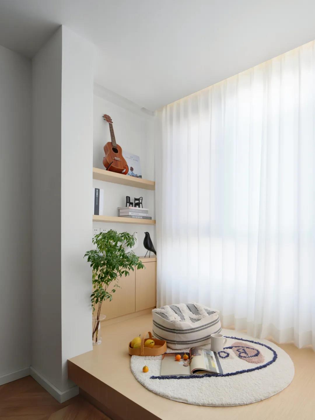 北陽臺納入餐廳空間,木質(zhì)地臺打造出一個(gè)隨意的休閑區(qū)域,看書觀景,輕松愜意。情致忽起,一曲尤克里里,音樂也融化在烘熔的焦香中。