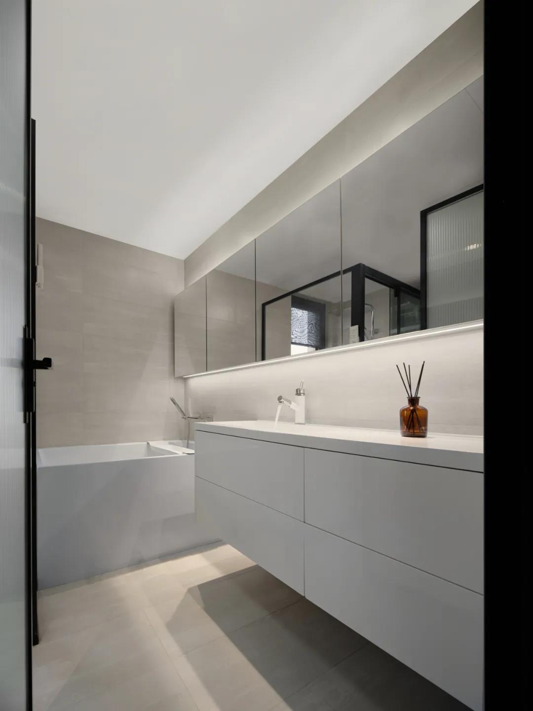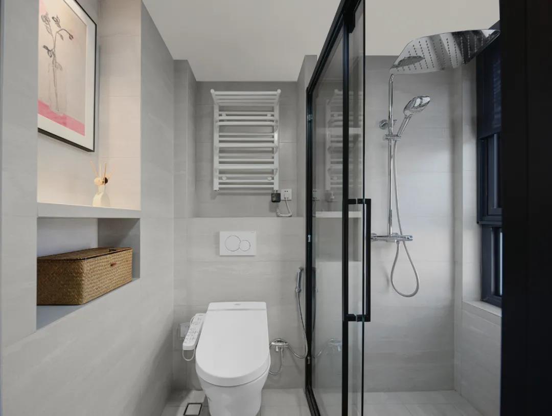 馬桶旁置物壁龕方便手機(jī)、書刊的放置,同時(shí)利用水箱上方的區(qū)域巧妙安裝了電熱毛巾架,設(shè)計(jì)細(xì)節(jié)貼心周到。