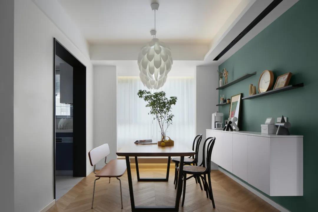 相連的客餐廳利用相同的色彩和材質(zhì),形成開放通透、風(fēng)格統(tǒng)一的起居格局,既保留了各自獨(dú)立又弱化邊界。