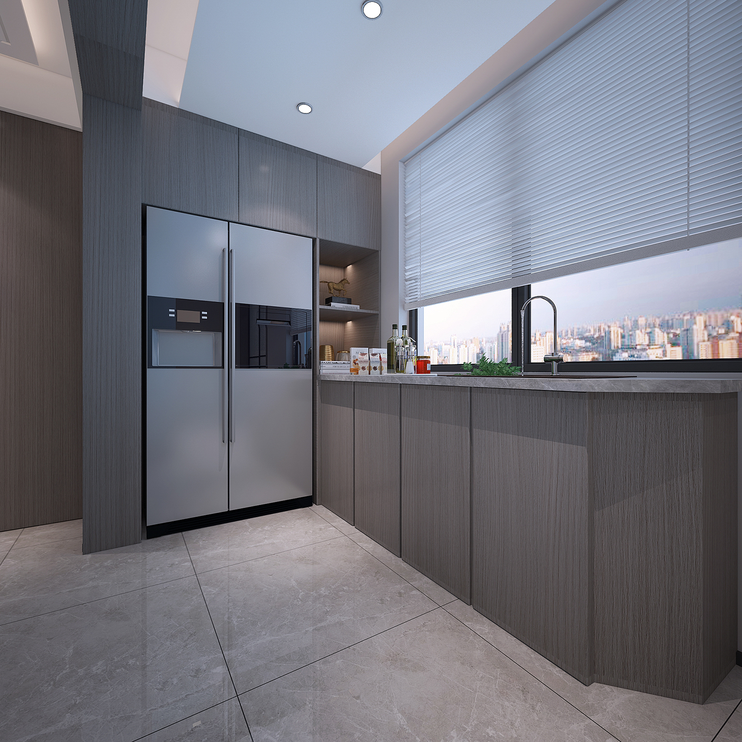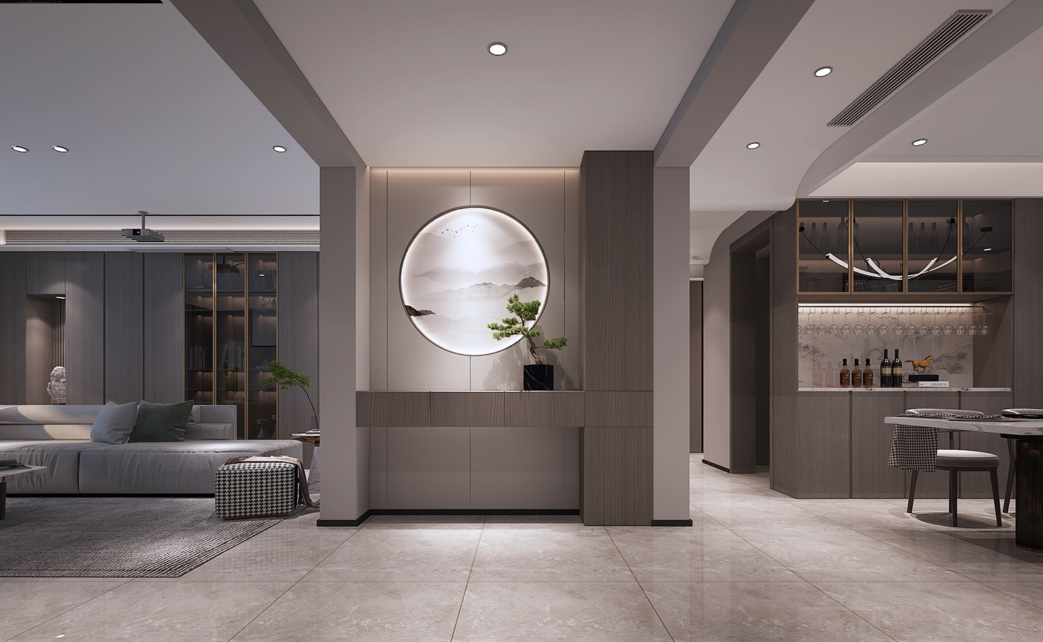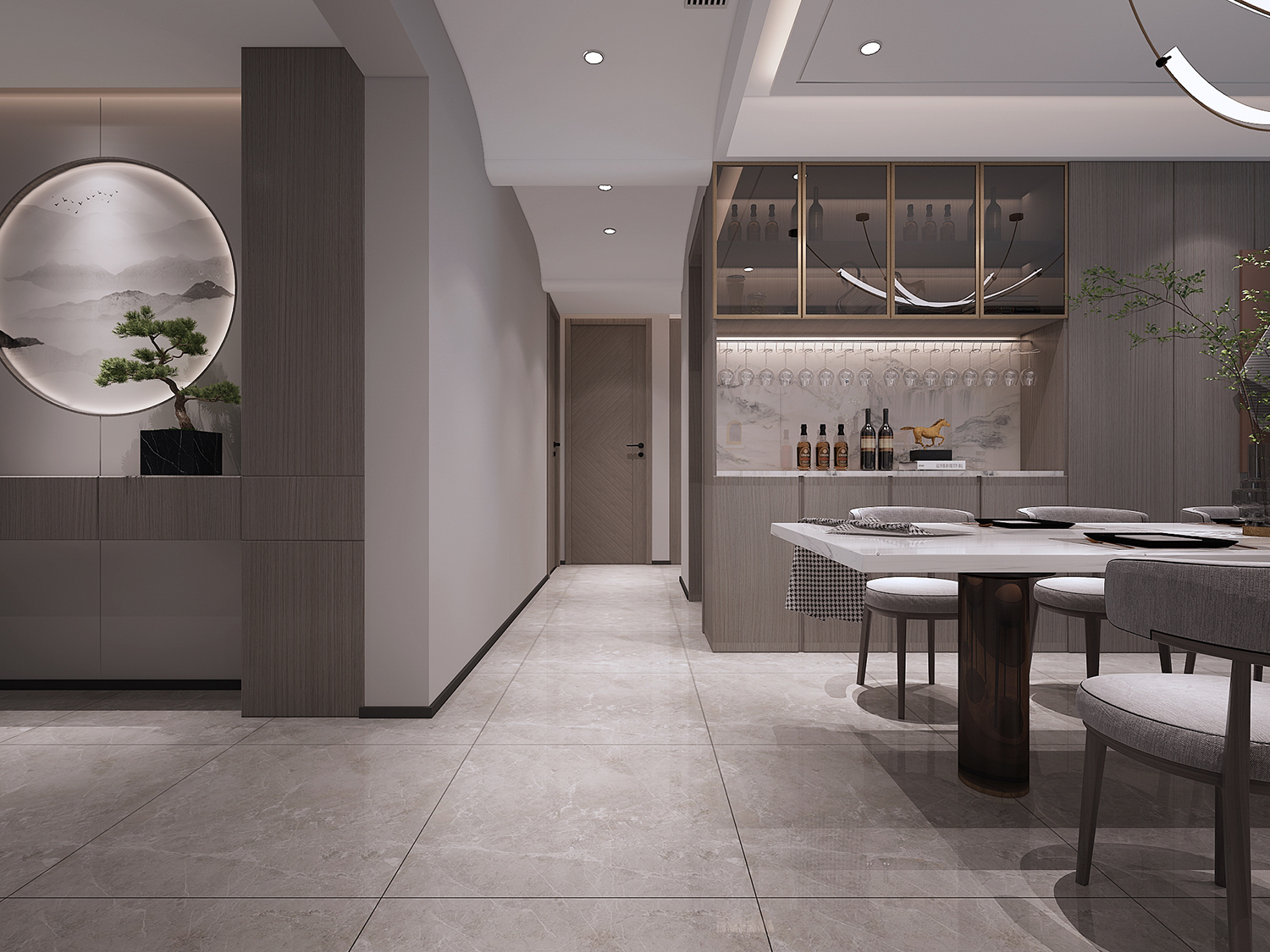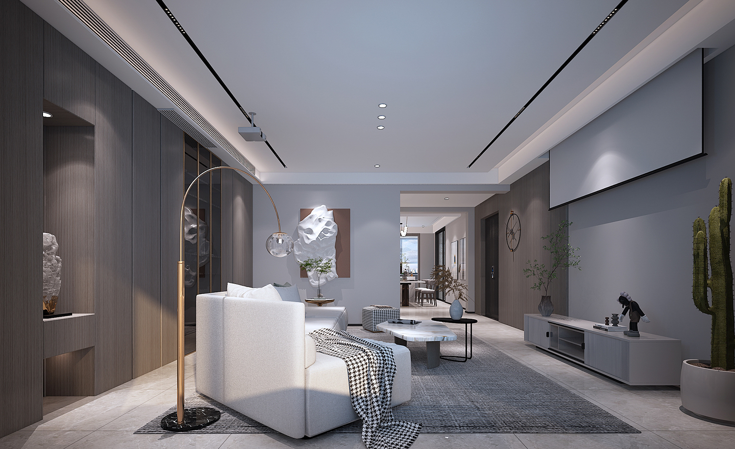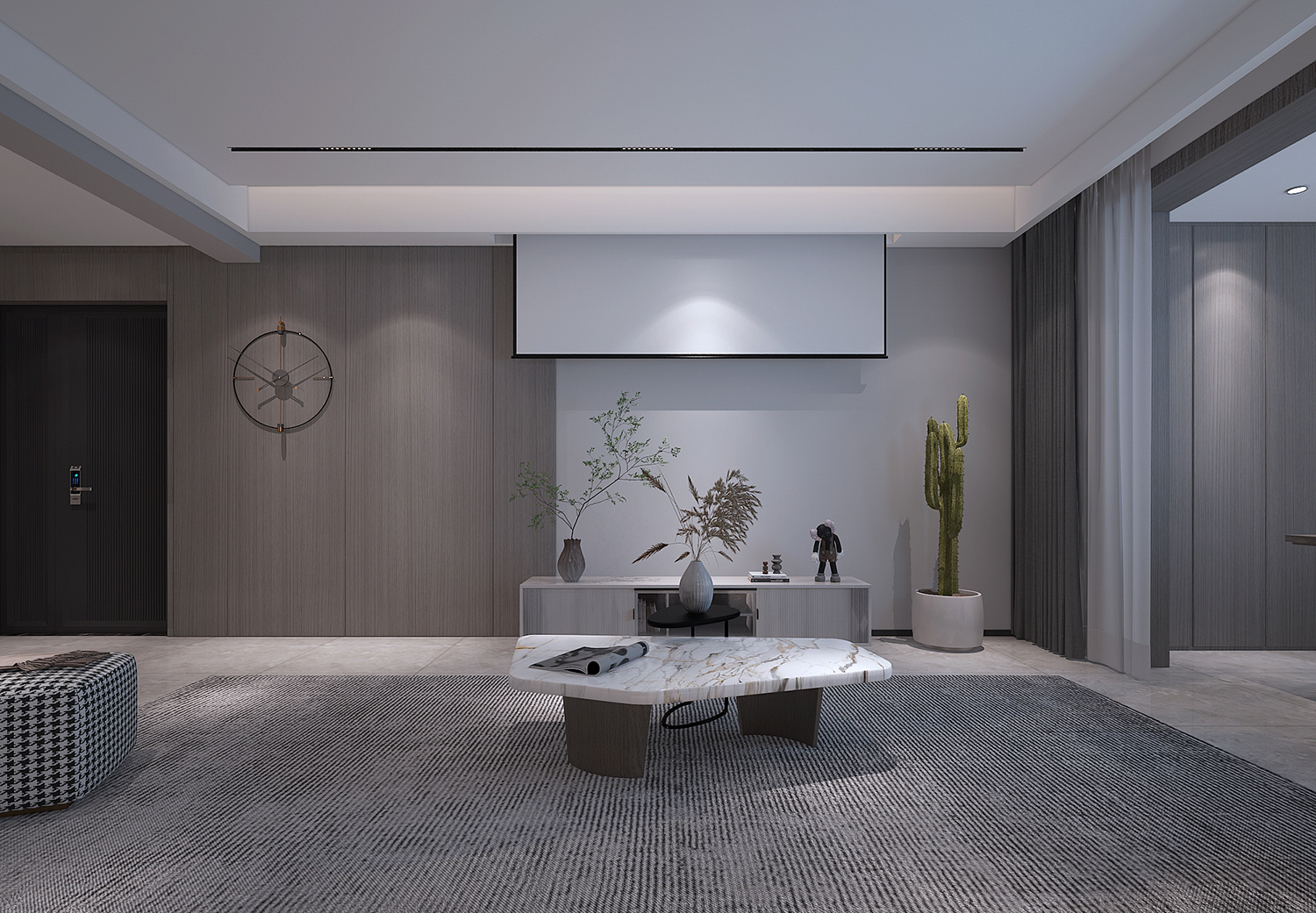 設(shè)計理念:本案整體為現(xiàn)代風格,大面積采用銀梨灰色木紋,時尚又不失沉穩(wěn),電視墻采用隱型門,保證了墻面的完整性,過道由于梁過低,采用波浪的手法,弱化梁的存在感,也讓整個空間更具設(shè)計感。