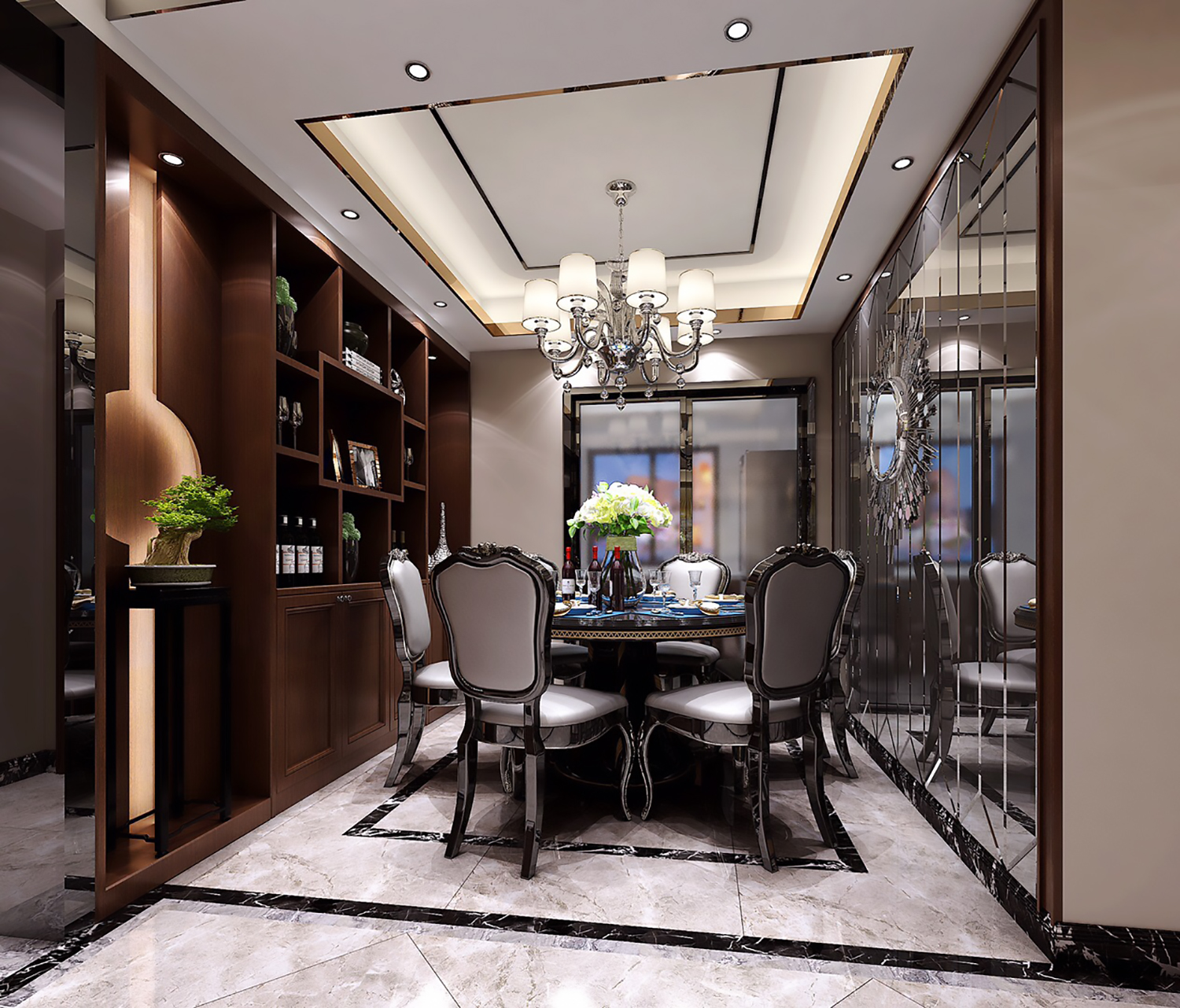 設(shè)計(jì)理念:案例采用灰色玻璃折射空間靈動(dòng),贈(zèng)添空間趣味性?;也矸瓷?,另一方面避免過多堅(jiān)硬的大理石帶來的冰冷與封固。再用閉合的不銹鋼點(diǎn)綴,用現(xiàn)代元素與手法,增強(qiáng)歷史文脈的特性