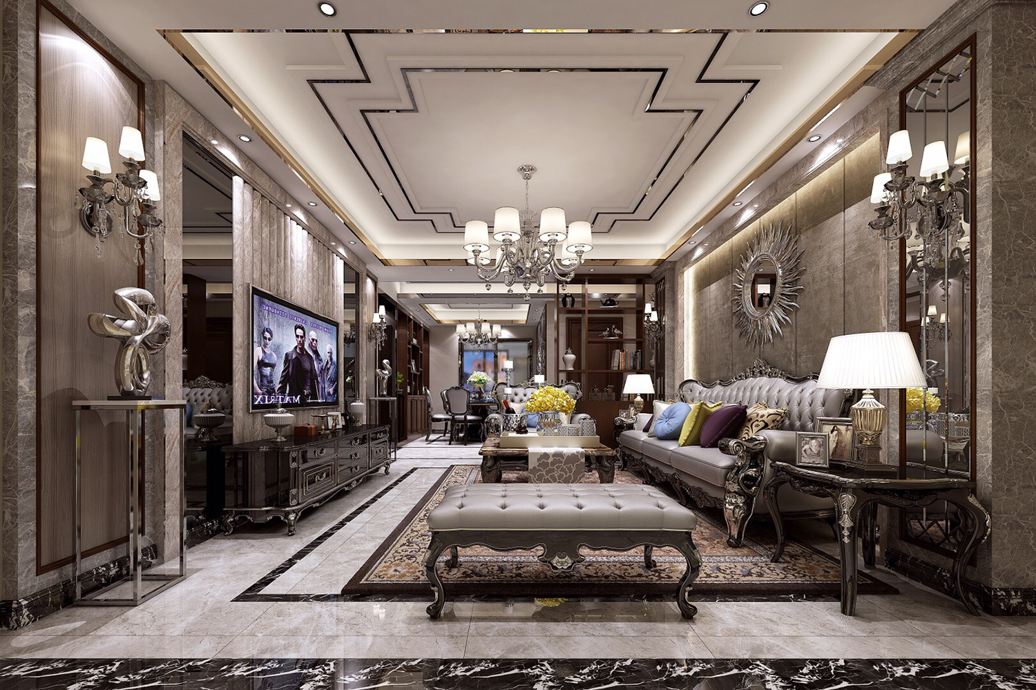同時(shí)運(yùn)用硬包和軟包陳列與大理石相間,既可以呼應(yīng)沙發(fā)等一系列軟裝,也為整個(gè)空間添入主題,活化空間,達(dá)到形散神聚,厚重生活的裝飾效果