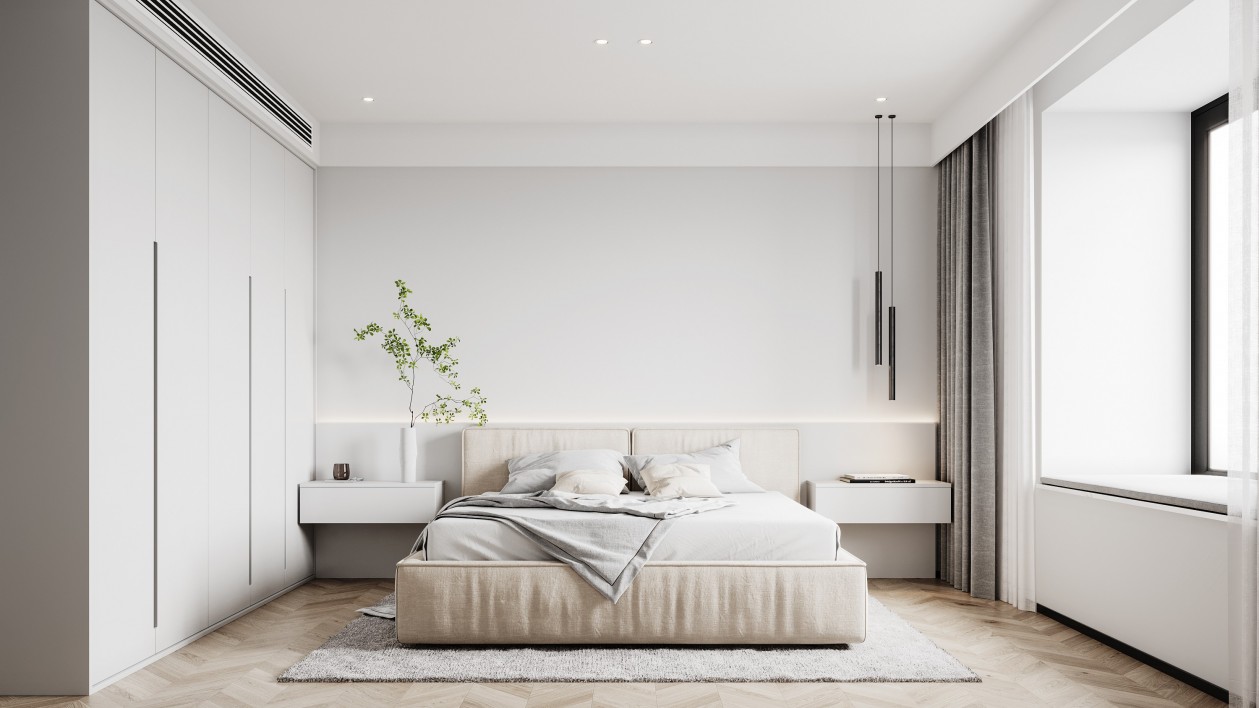 次臥空間色彩統(tǒng)一,以白色為主,素雅潔凈。同樣的無主燈設(shè)計,營造空間的光感氛圍。