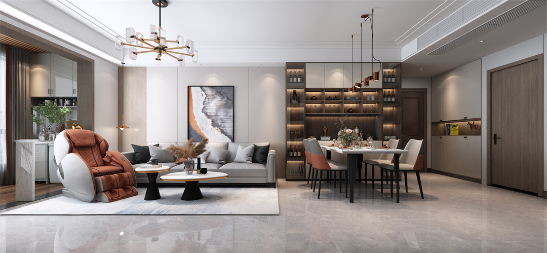 沙發(fā)背景以護(hù)墻板+掛畫做造型裝飾,不銹鋼線條層次分割,與酒柜形成動(dòng)靜分區(qū),更好的服務(wù)空間,藝術(shù)生活。
