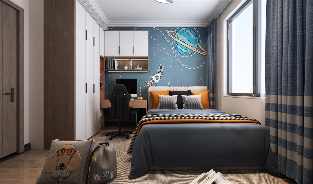 我愿變成一只自由的小鳥,在快樂中觸摸云層,感受星際的浩瀚無邊。男孩房以藍(lán)色星空為主題,融合學(xué)習(xí)功能,希望給孩子創(chuàng)造一個(gè)能激發(fā)想象力和好奇心的奇趣空間。