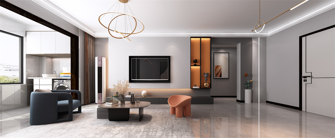 電視墻采用懸浮背景,一側(cè)定制開放格做收納展示,以愛馬仕橙做背板,增加輕奢的空間質(zhì)感。