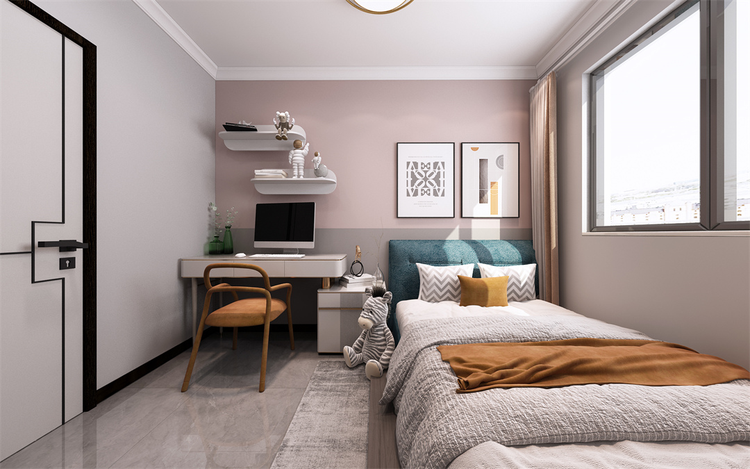 兒童房增加書桌的陳設(shè),增加背景色,讓空間更加溫暖。