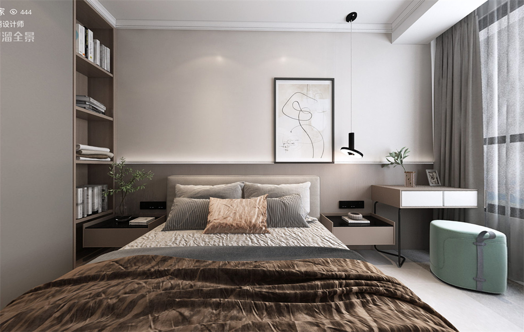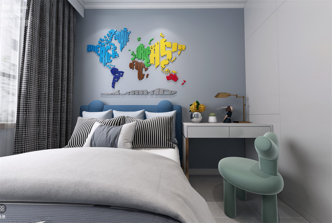 業(yè)主男孩兒所在的臥室,利用藍(lán)色床品+窗簾等軟裝,營(yíng)造安靜的居住空間。書(shū)桌和柜體連體設(shè)計(jì),既滿足了孩子學(xué)習(xí)的需求,也滿足了儲(chǔ)物的需求。