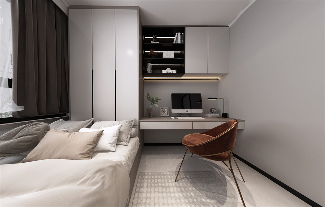 次臥整體空間定制,衣柜連接書(shū)桌,增強(qiáng)功能的實(shí)用性。