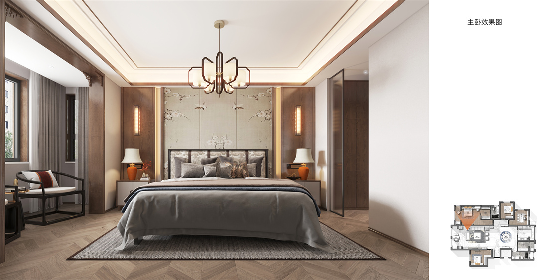 主臥背景墻以花鳥壁布結(jié)合護墻板做造型設(shè)計,陽臺融入空間,寫意山河開闊,象征業(yè)主對自然的憧憬和自由的向往。