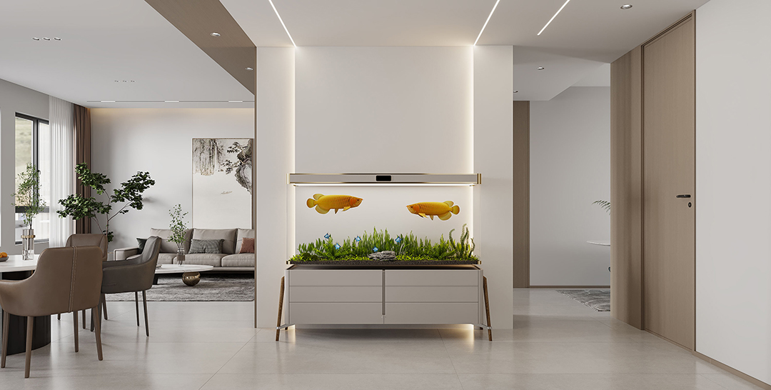 玄關(guān)設(shè)計簡潔大方,魚缸加上燈光,給人一種回家的溫馨感。