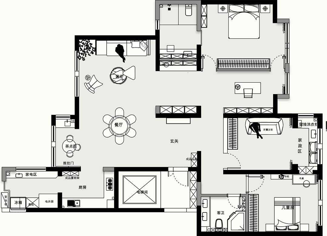 本案特點:本案業(yè)主是一家三口居住,男業(yè)主經(jīng)營一家公司,平時比較忙,家里的裝修基本上都是女業(yè)主在操心,比較注重整體格局,而女業(yè)主比較注重整體收納和后期的清潔工作。