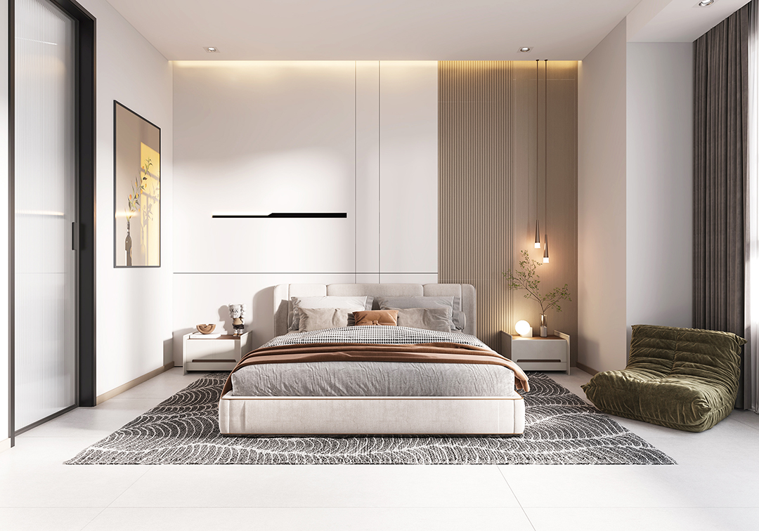 臥室溫馨舒適,以白色為主色調(diào),草綠色懶人沙發(fā)作為點綴,讓空間顯得輕松且富有氛圍感。