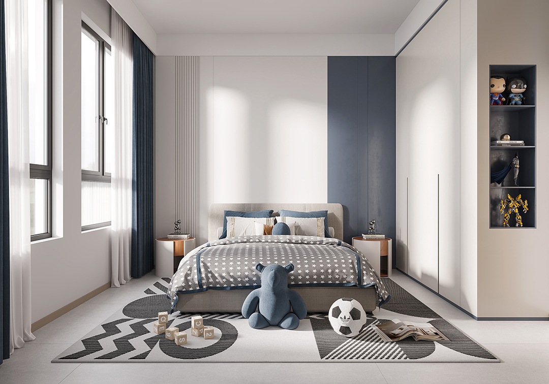 男孩房以白+藍(lán)護(hù)墻板作為床頭背景墻,配上同色系窗簾,優(yōu)雅靜謐,賦予空間自然舒適感。