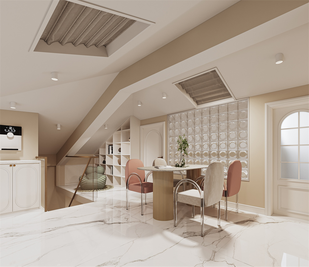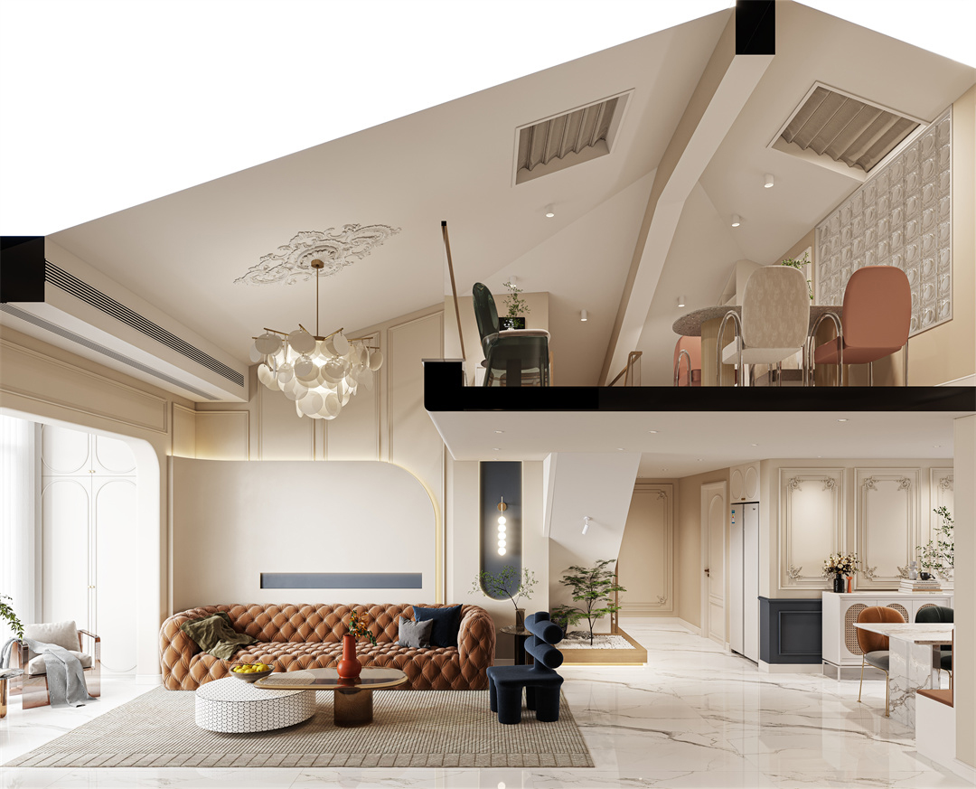 設(shè)計理念:本案戶型為頂樓復式帶露臺,設(shè)計師在設(shè)計之初確定整體加建的空間,保留了客廳的挑空,同時在餐廳空間做了加層,使空間利用率更高。而在風格上,以現(xiàn)代簡約為主,使用法式線條與現(xiàn)代造型結(jié)合,通過局部顏色的點綴,營造出整體時尚,精致的感覺。