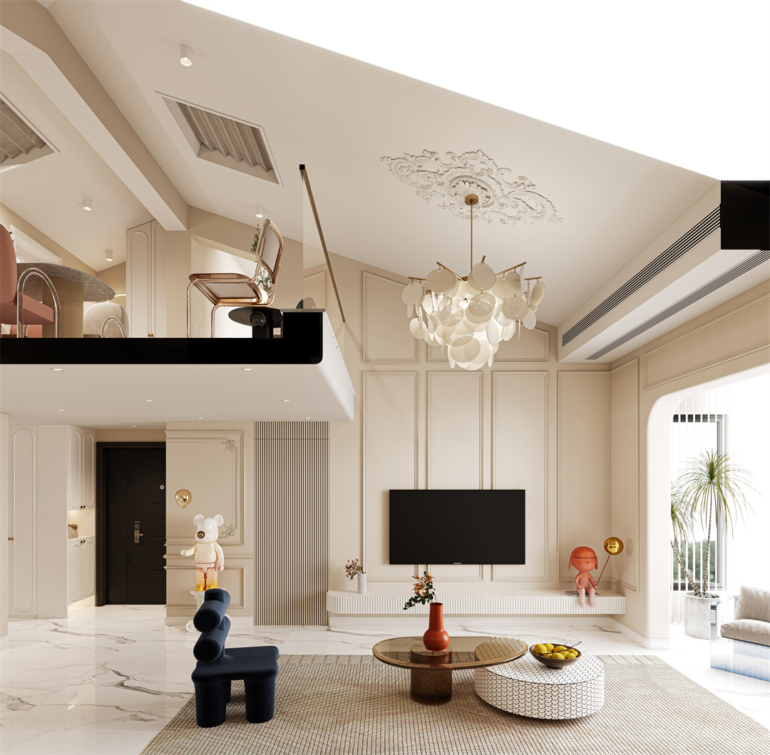 客廳這里,沙發(fā)背景墻使用經(jīng)典的法式元素,沒有刻意雕琢,用簡單的石膏線條裝飾讓整個空間顯得開闊又精致。