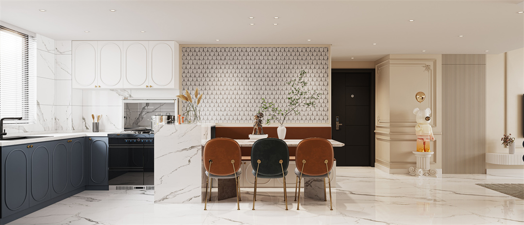結(jié)合戶型特色和客戶需求,打開廚房,使廚餐廳整體感覺更加的通透。