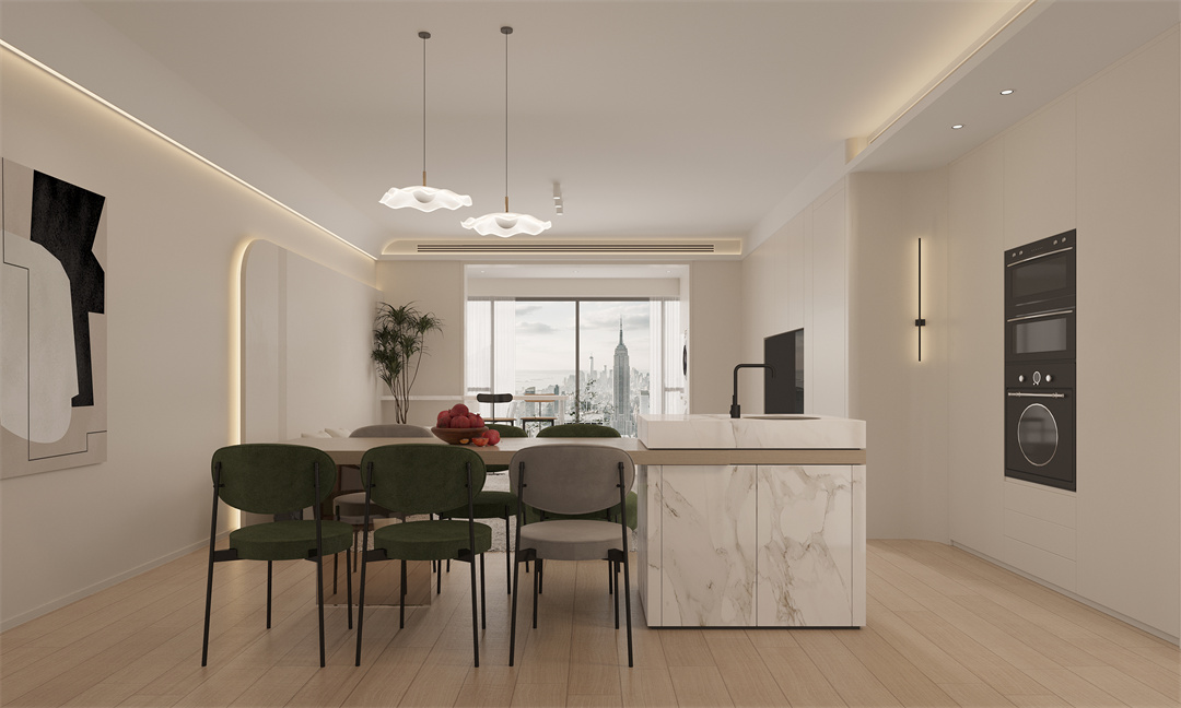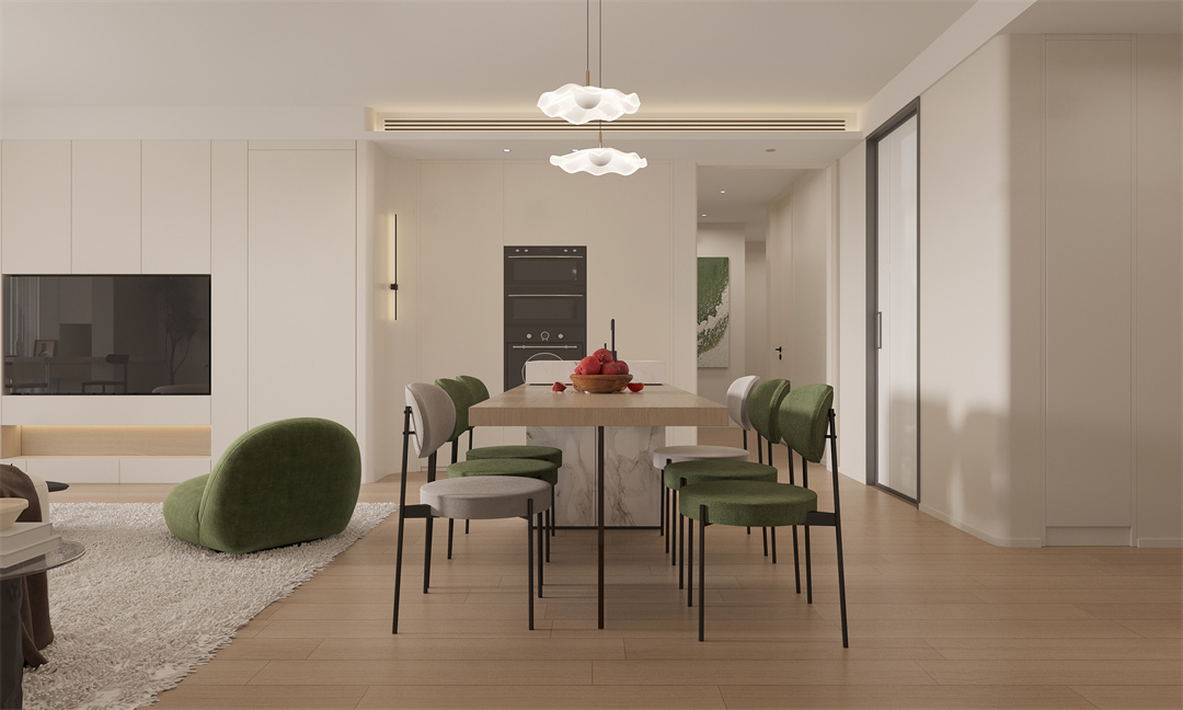 奶油風的餐廳,往往會帶著幾分侘寂風的感覺,當帶有綠色元素的餐椅搭配木質餐桌時,幽靜純粹的質樸感立馬就有了。