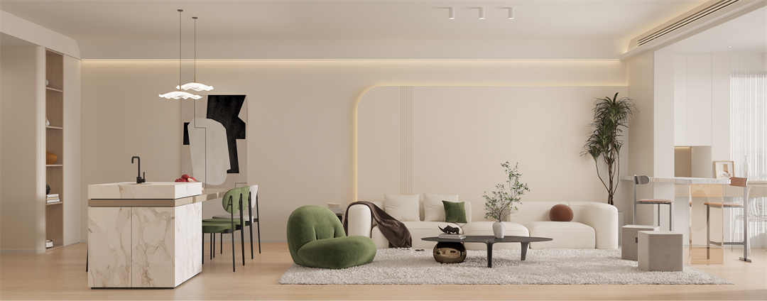 介于白色和黃色之間的奶油色,也是一種百搭的色調,它可以讓空間既溫暖又時尚,再加上綠色沙發(fā)和綠植做點綴,不僅能在溫柔中增添幾分清冷特更能表現(xiàn)出家的優(yōu)雅干凈。