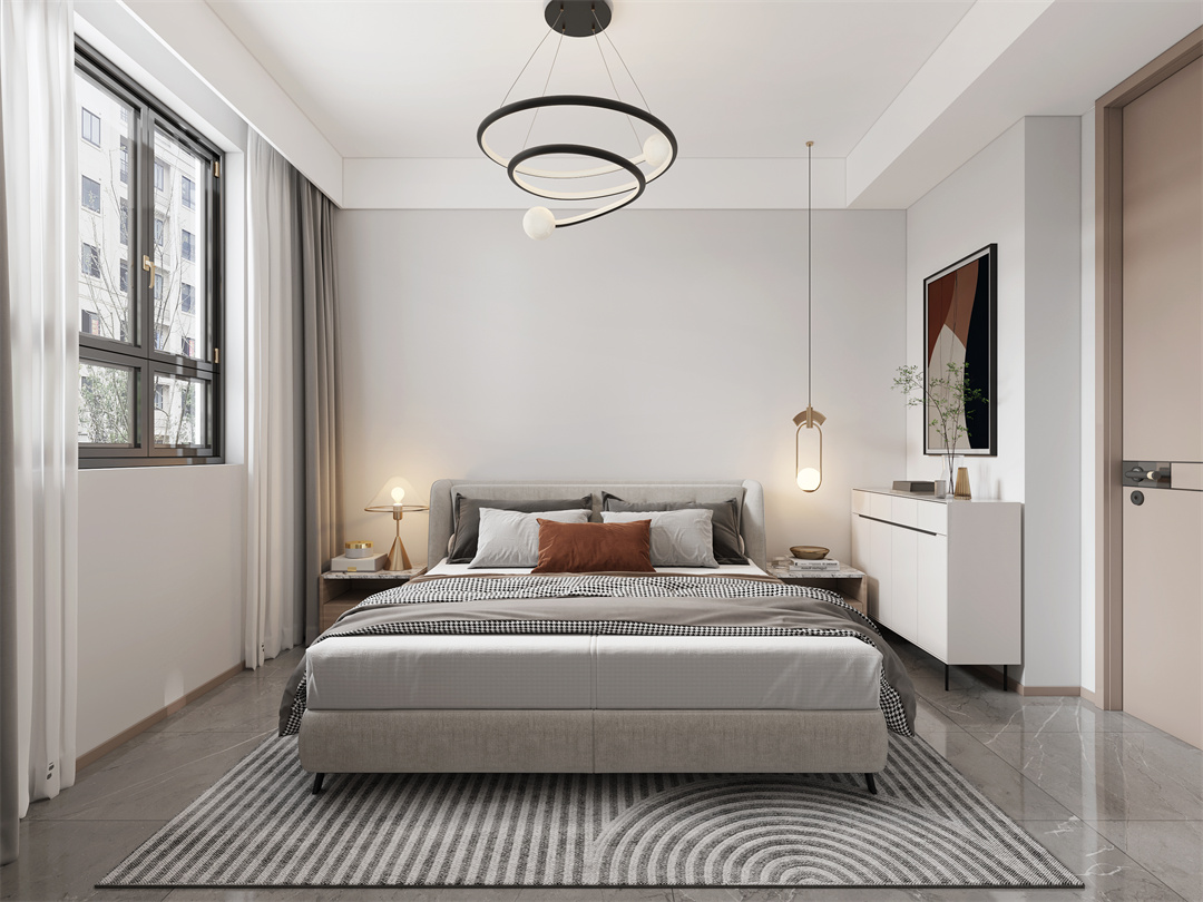 主臥整體硬裝與軟裝都以白色與木質(zhì)感的空間為主,加入灰色毯子與枕頭,也是點(diǎn)亮了空間的高級設(shè)計(jì)感。側(cè)邊的衣柜以白色為主,搭配在低調(diào)的高級灰空間里,效果也是更加和諧統(tǒng)一。