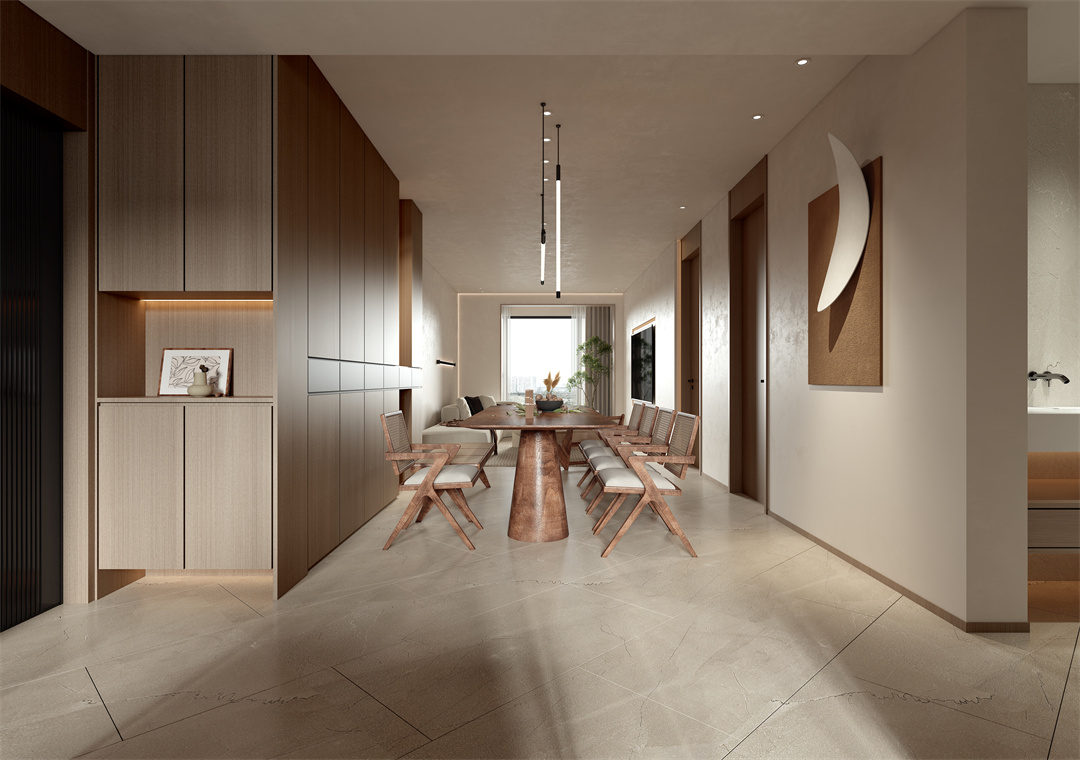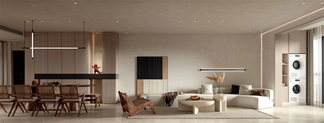 客餐廳空間一體化設(shè)計(jì),使得空間自帶放大效果,島臺(tái)與餐桌關(guān)系可根據(jù)不同場景以及人數(shù)使用自由組合。