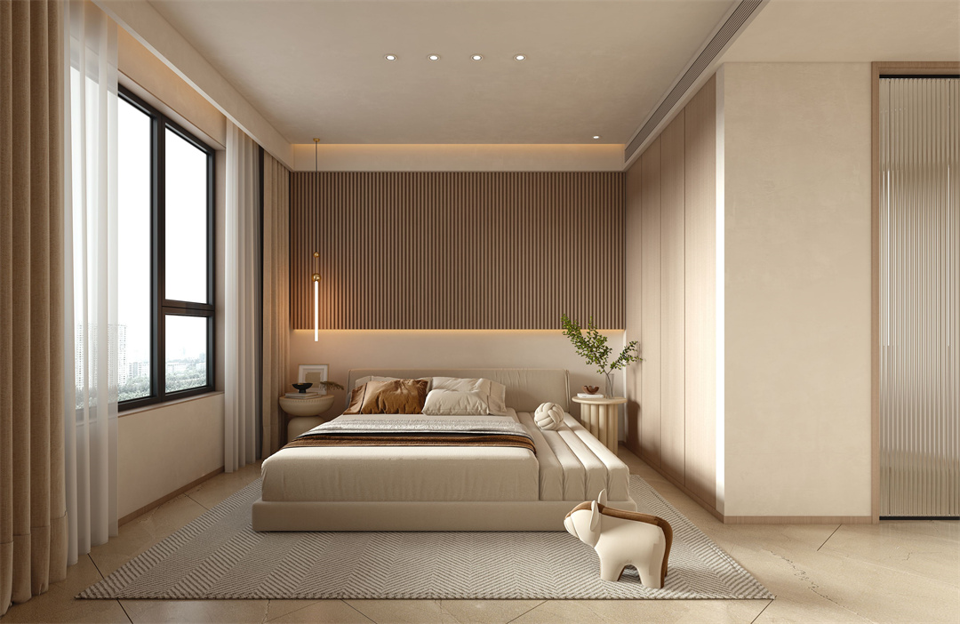 主臥設(shè)計(jì)更偏向極簡舒適,這是一個(gè)幸福指數(shù)極高的主臥套房,經(jīng)過空間合理的利用,功能與顏值都拉到了極高。