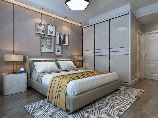 主臥,硬包床頭,稀疏的照片墻,初見(jiàn)便覺(jué)空間優(yōu)雅謙遜、低調(diào)內(nèi)斂。臥室在色彩的選擇上單純、飽滿,再選用更為暖意的實(shí)木地板,使空間更加通透