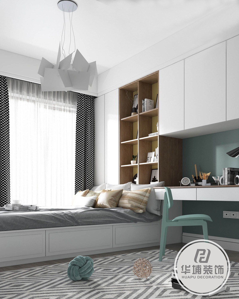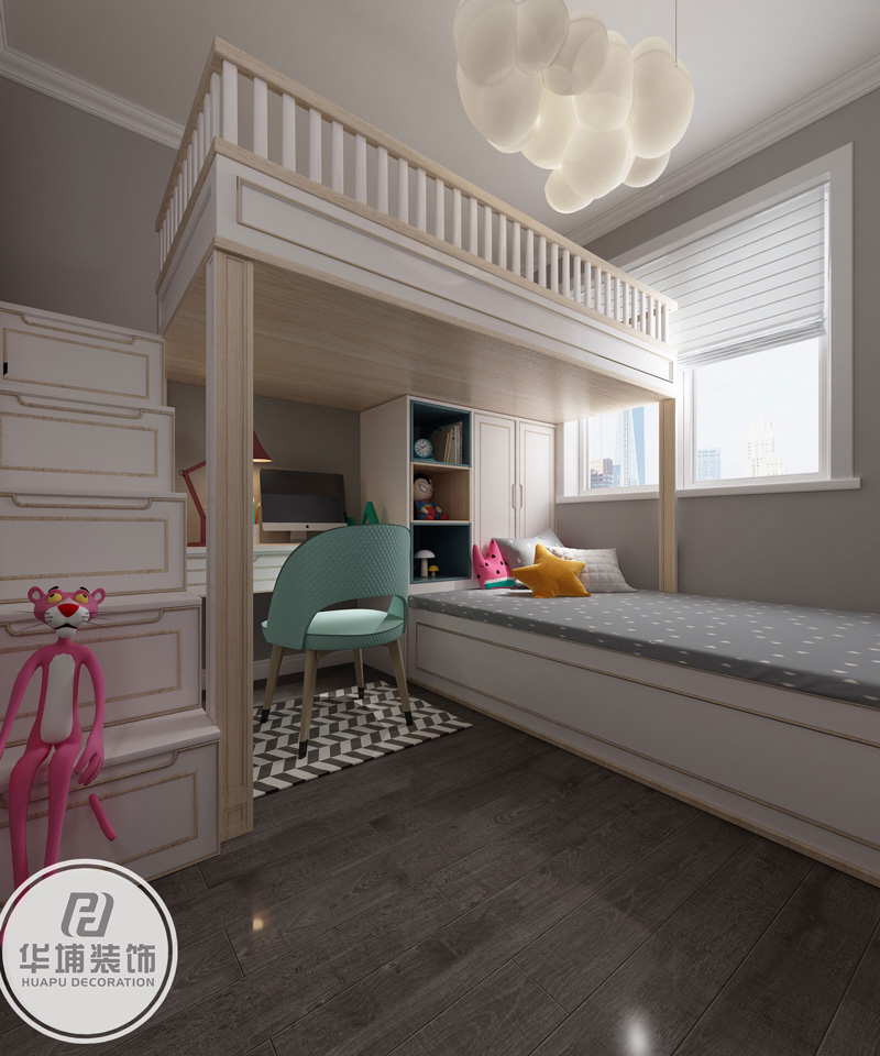 設(shè)計(jì)理念:對(duì)空間利用和收納比較關(guān)注,同時(shí)希望給三個(gè)孩子充足的學(xué)習(xí)和互動(dòng)空間,所以將原有的陽(yáng)臺(tái)打掉改為升降臺(tái)式榻榻米,既可以學(xué)習(xí)看書(shū),也放方便孩子玩耍。同時(shí)在餐廳處設(shè)置卡座空間,充分利用卡座下方的儲(chǔ)物空間。兒童房采用高低床的設(shè)計(jì),可以兼容兩個(gè)寶寶的學(xué)習(xí)和休息空間。