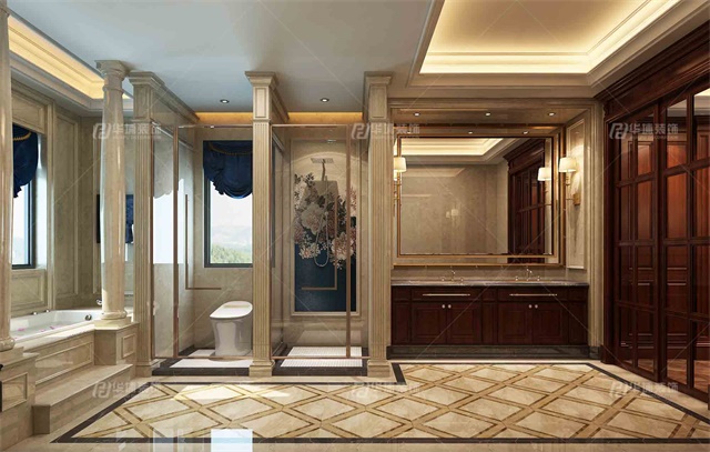 衛(wèi)生間,在色彩上,運(yùn)用明黃、米白等古典常用色來(lái)渲染空間氛圍,營(yíng)造出富麗堂皇的效果。在材質(zhì)上,運(yùn)用仿古地磚,歐式壁紙,強(qiáng)調(diào)了穩(wěn)重華貴與舒適