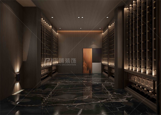 儲酒室地面采用黑白紋大理石簡潔大氣,柜體燈、吊頂反向燈槽、柜臺、裝飾畫,采用不同的色溫,不同的色彩,打造酒室出低調(diào)輕奢的氛圍。
