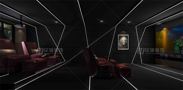 影音室頂、墻、地、連通交錯的線條燈突出個性,昏暗的空間更具有家庭電影院的氛圍。