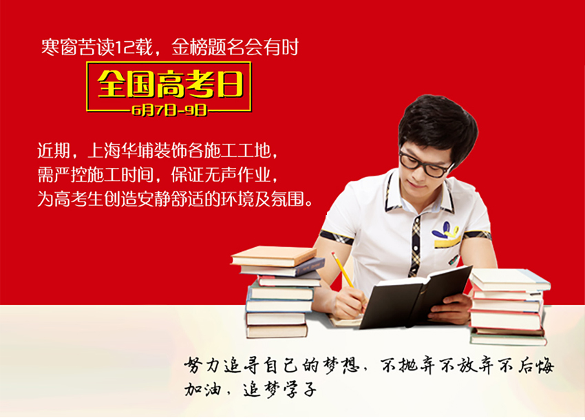 華埔裝飾承諾:高考期間,華埔裝飾各施工工地,會嚴控施工時間,保證無聲作業(yè),為高考生創(chuàng)造安靜舒適的環(huán)境及氛圍。同時,我們呼吁,高考期間,大家盡量不開車出行,開車經(jīng)過各個考點不鳴笛、不搶道,做到文明出行。