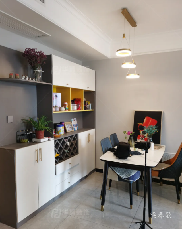 餐廳靠墻的部位做了餐邊柜的陳設(shè),開放+閉合組合,既是收納,也可以作為展示。餐邊柜下體部分還內(nèi)嵌了酒架,來迎合業(yè)主品酒藏酒愛好。