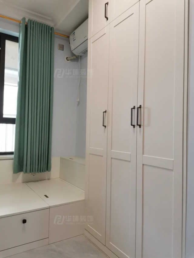 主臥以藍(lán)色調(diào)為主,不管是淡藍(lán)色的墻面背景,還是墨藍(lán)色的布藝窗簾,都將空間淡雅脫俗的氛圍感凸顯,尤其是到夏天,很清涼。