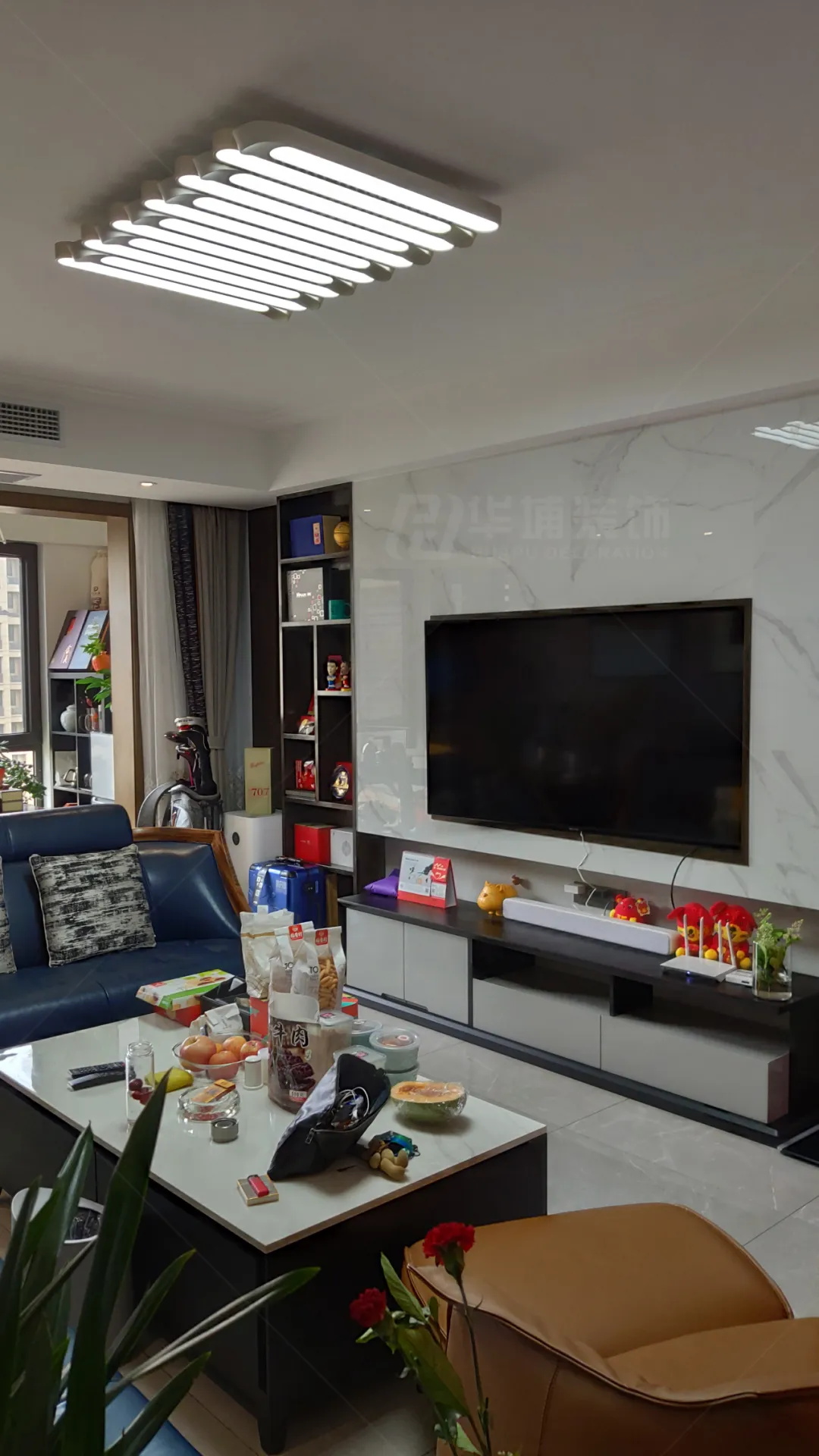客廳是滿載生活氣息的區(qū)域,我們敲門做采訪的時候,業(yè)主家小姐姐正在跳電競舞,再看桌上的小零食,這絕對是一個熱愛生活的家庭。客廳,我們?nèi)胙劭吹降挠惭b部分是比較純素的,因為是中央空調(diào),家里東西又多,為了不顯得太過擁擠,頂面做了簡單的處理,以一組主燈作為唯一光源。電視墻是以石材+儲物格的方式做設(shè)計,預(yù)留出魚缸的位置,將家里一些零散的物品收納。
