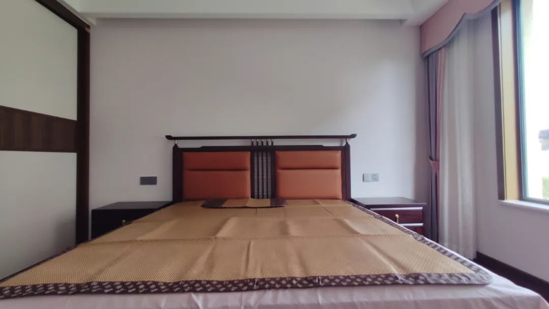 老人房以干凈溫馨為主,設(shè)計(jì)師用新中式特有的胡桃木色搭配皇帝色,來提亮整個(gè)空間。設(shè)計(jì)師小心思:窗簾選用棉緞質(zhì)感,它的垂度和密度相對(duì)較高,不會(huì)透光,這樣就解決了老人睡眠淺的問題。