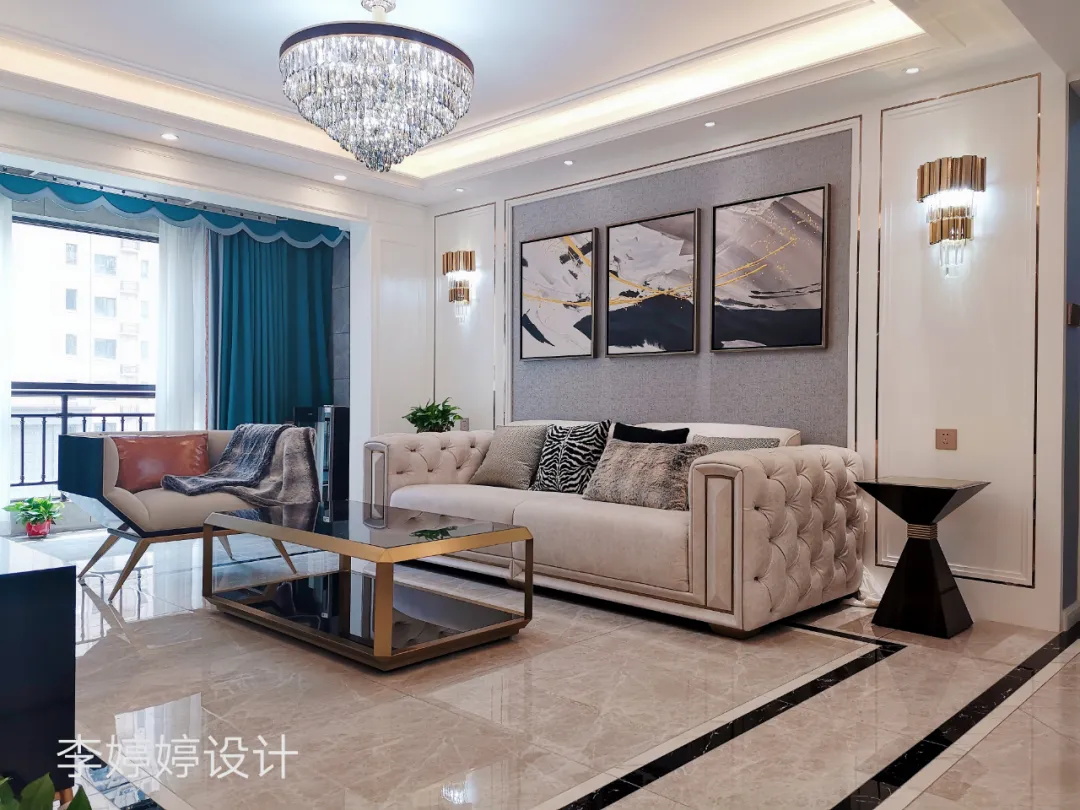 浮華退盡,歸于清寧??蛷d整體以白色+金色構(gòu)圖,石膏線、護(hù)墻板、金屬條、水晶燈,光影交錯,滿目高級。客廳的軟裝是精心挑選的,金屬邊幾、抽象掛畫、薄紗窗幔,從材質(zhì)到配色再到花紋,用細(xì)節(jié)做空間情緒的表達(dá),“冷”“暖”相知。
