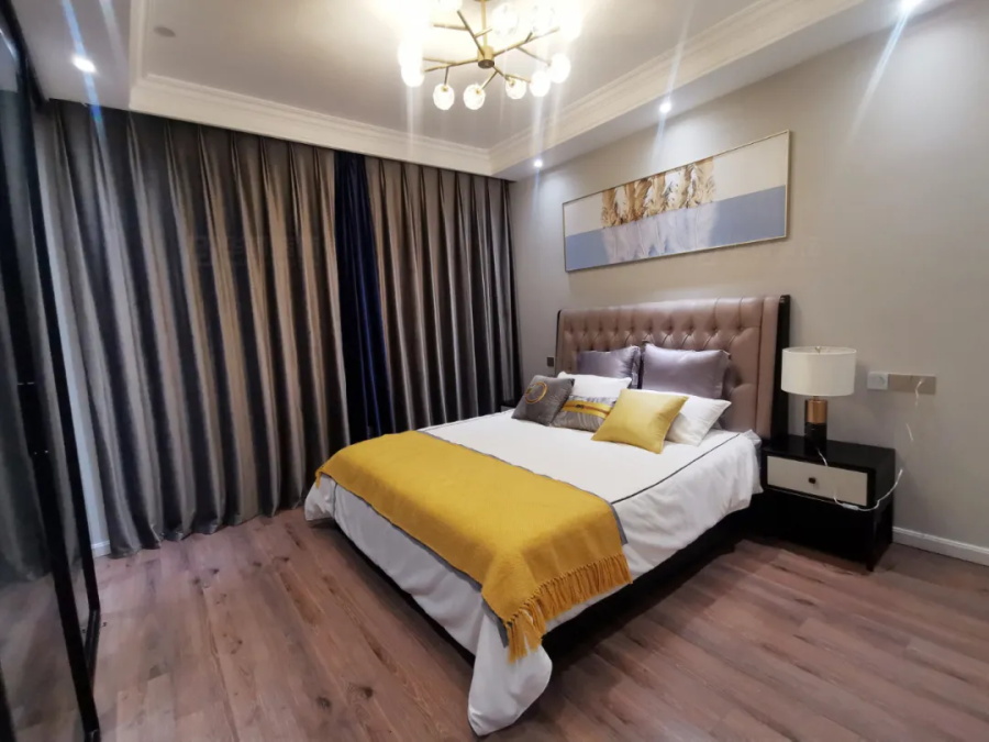 主臥,一抹亮黃非常吸睛。推拉式電視墻,讓睡前的時(shí)光更加美好。