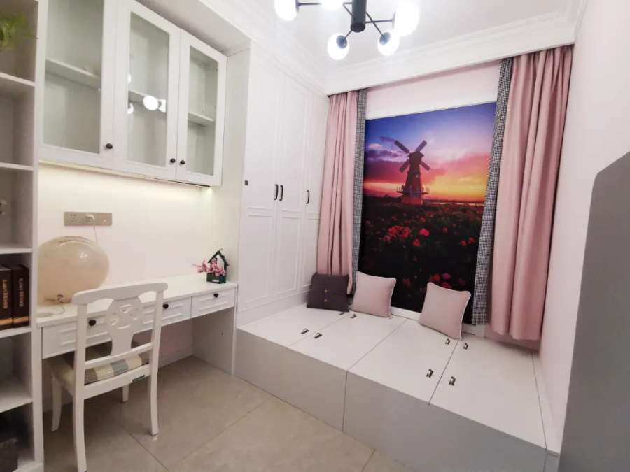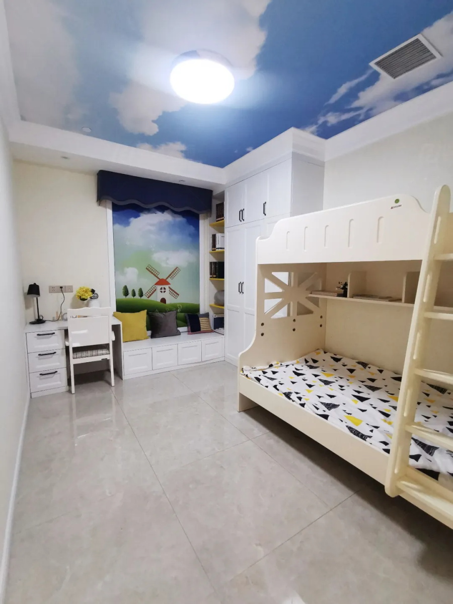 兒童房做了上下鋪,不論是兩個(gè)小孩同住,還是老人幫忙帶,都很方便。靠飄窗一側(cè)還做了飄窗連柜書桌,飄窗墻體內(nèi)嵌收納,非常實(shí)用。