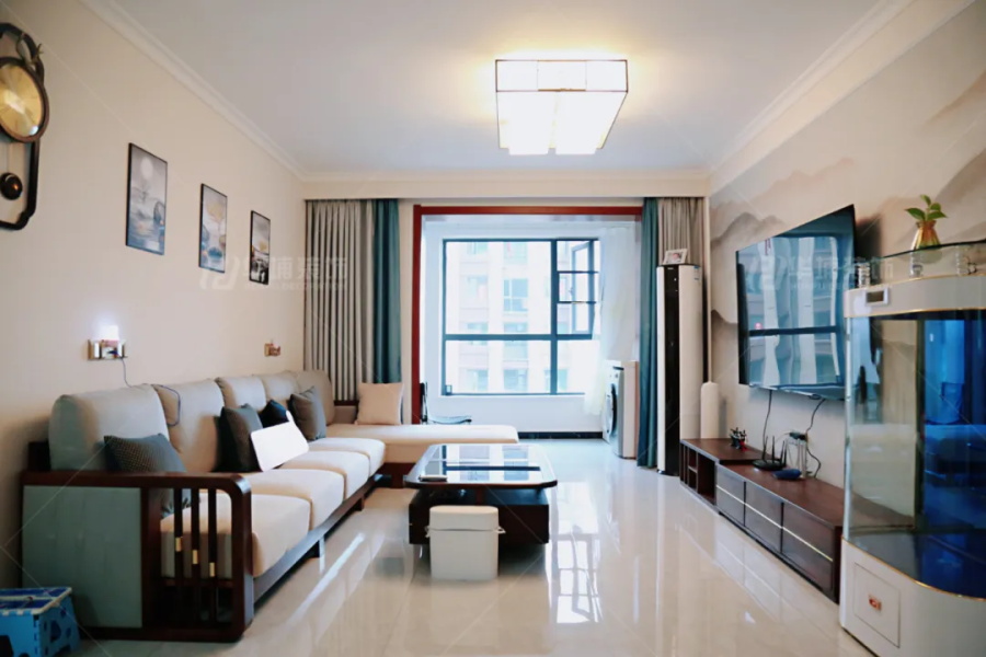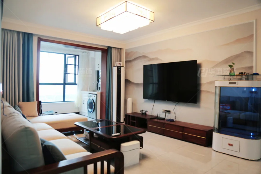 客廳是淺淺的中式風(fēng),淡泊寧靜。整個(gè)空間很開闊,配色輕揚(yáng),曲調(diào)溫暖。電視背景精選一幅山水壁布,水墨丹青,歲月靜好。