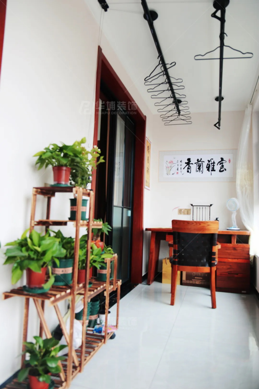 客廳陽臺(tái)是一個(gè)大通廊,兩頭分區(qū)。一側(cè)做書房,平時(shí)張叔叔練練書法,陶冶情操;另一側(cè)是洗衣房,李阿姨打點(diǎn)生活的場(chǎng)所。