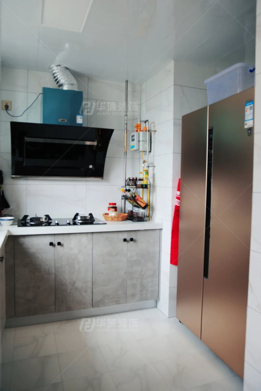 這是一個(gè)入戶沒有玄關(guān)的戶型,進(jìn)門右側(cè)就是廚房,這樣就導(dǎo)致了廚房采光差、面積小。為了合理分化空間,設(shè)計(jì)師將廚房門體砸掉做嵌入式鞋柜,這樣剛好在廚房內(nèi)側(cè)預(yù)留出冰箱嵌入的空間,完美組局。